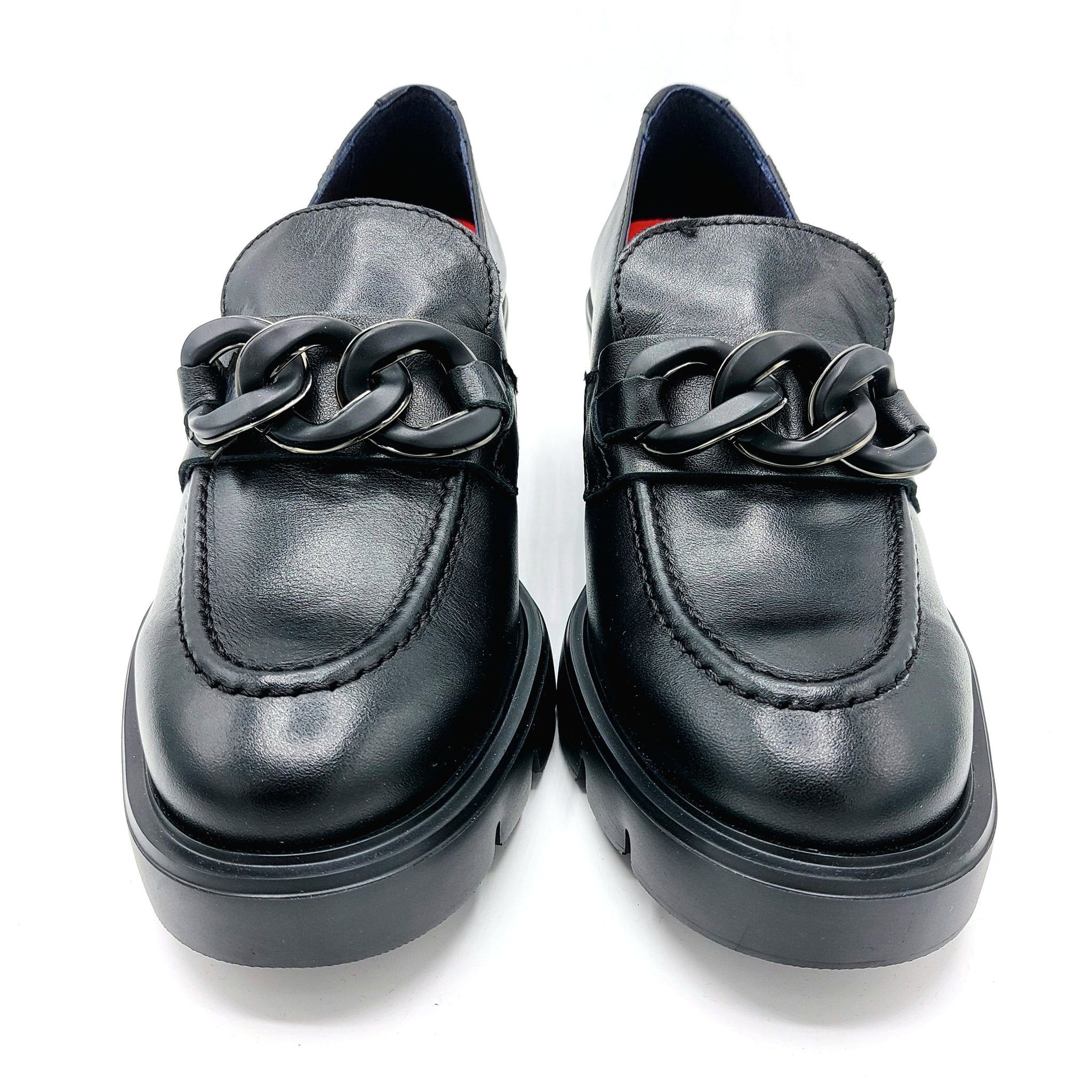 Pratico mocassino donna in pelle nera, arricchito da una raffinata catenina frontale tono su tono che aggiunge un tocco di stile discreto. Morbido e confortevole, è perfetto per accompagnarti con classe nelle tue giornate, garantendo comfort e raffinatezza in ogni passo.