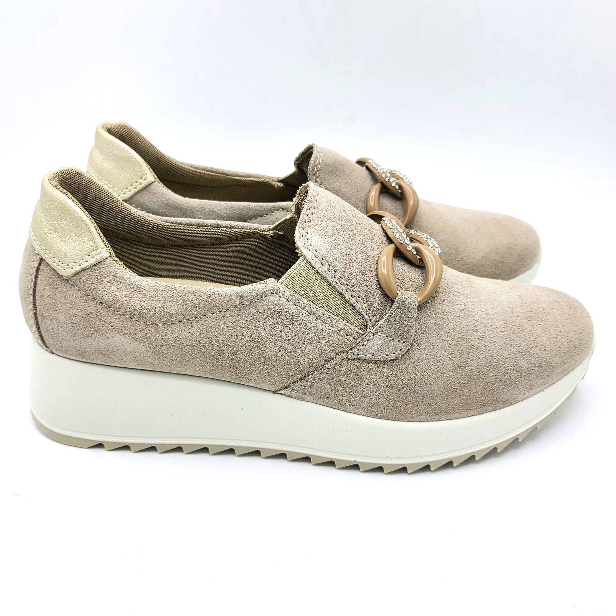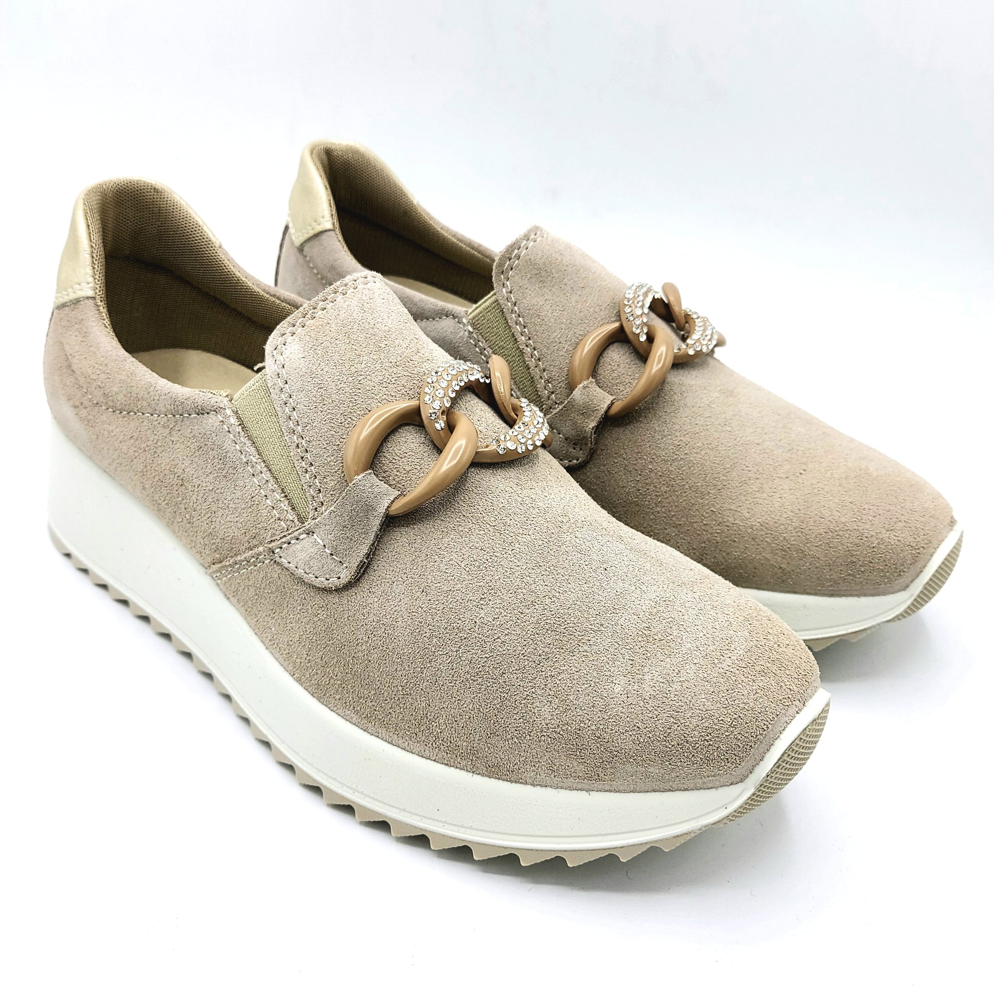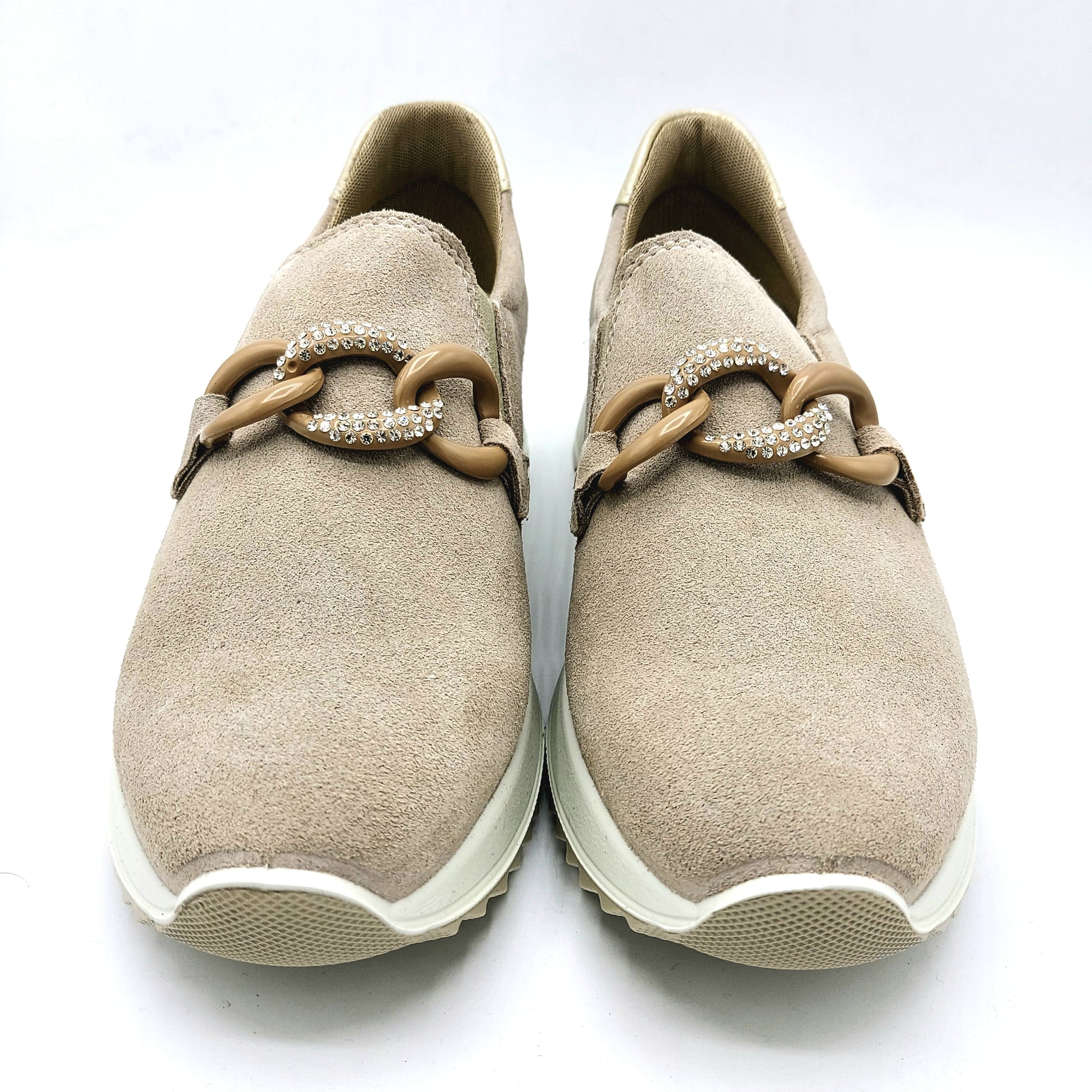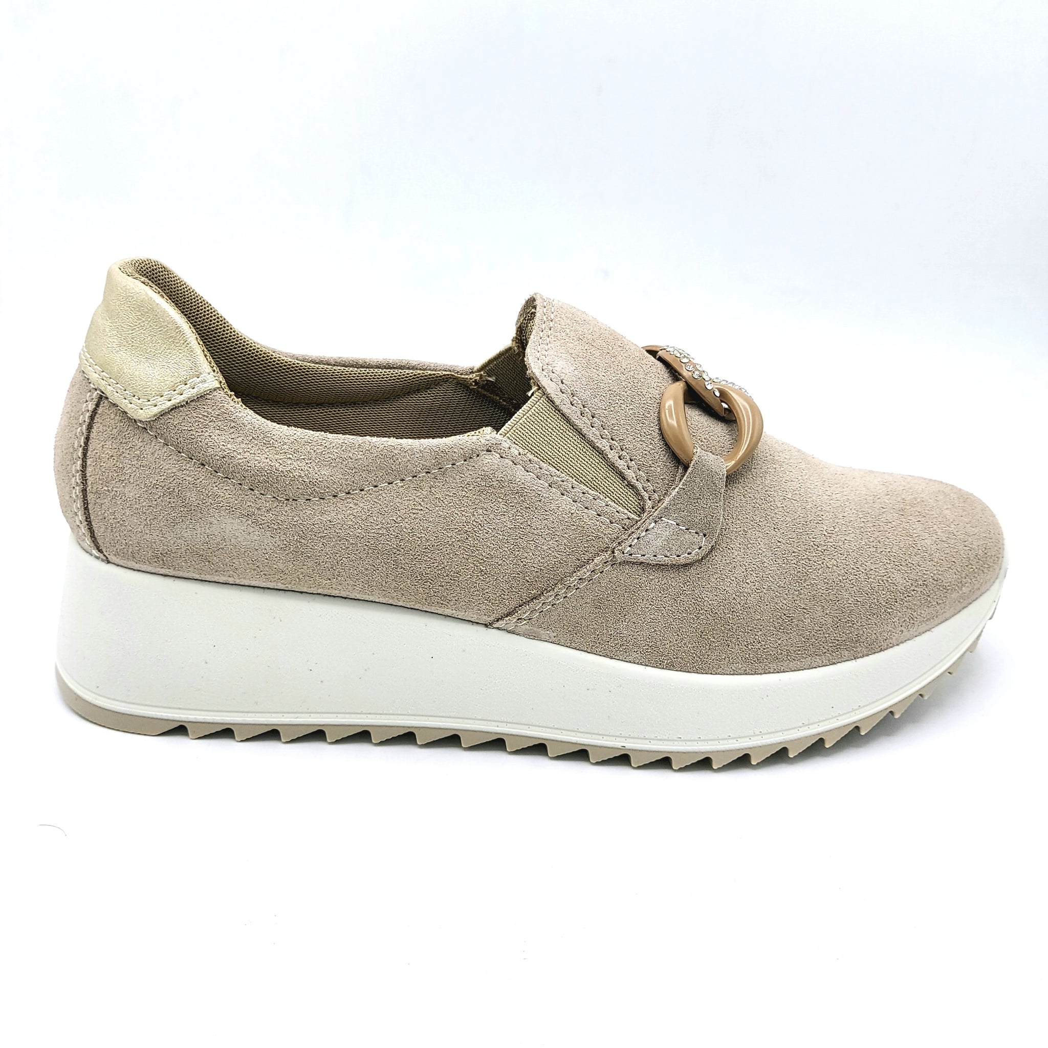 Mocassino pratico in pelle scamosciata che unisce comfort e stile. La decorazione frontale aggiunge un tocco di raffinatezza, perfetto per chi ricerca un'opzione versatile da indossare in diverse occasioni. La morbidezza della scamosciatura garantisce una calzata confortevole durante tutta la giornata, mentre il design sobrio lo rende facile da abbinare con il tuo guardaroba.