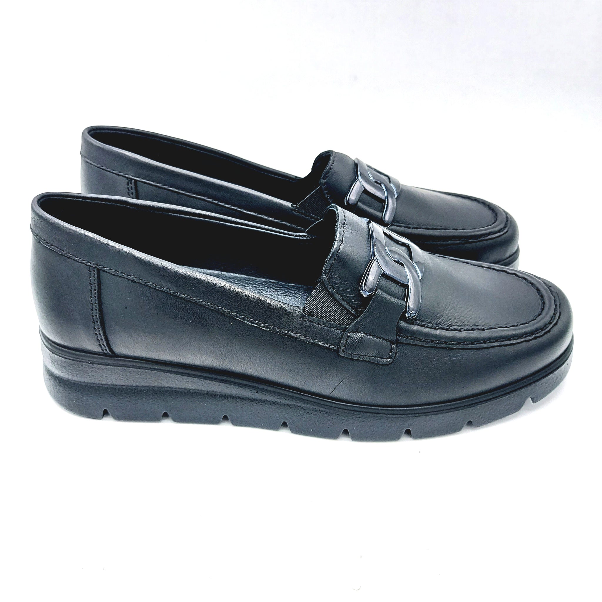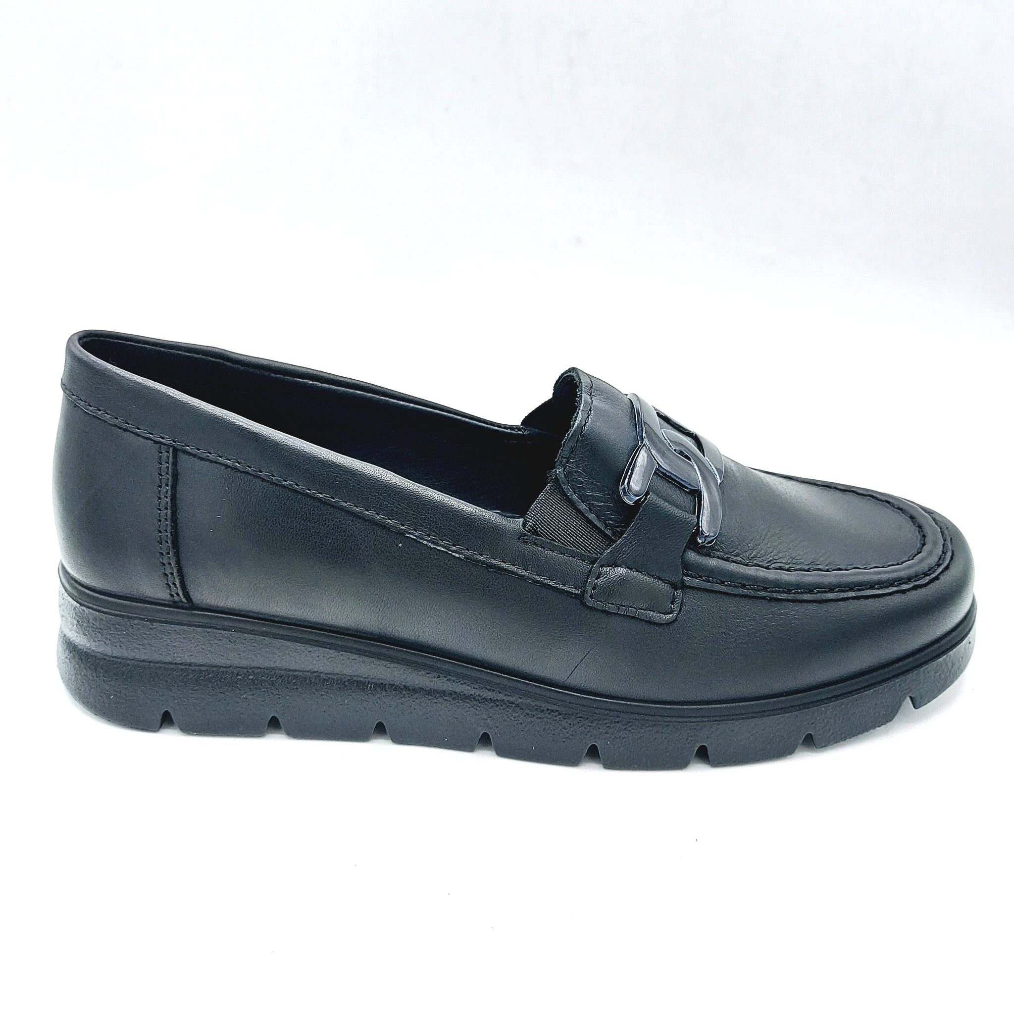 Questo mocassino in pelle Enval 8756700, colore nero, unisce eleganza e comfort grazie alla sua zeppa bassa che assicura una camminata stabile per tutta la giornata. La catenina decorativa aggiunge un tocco di stile raffinato, ideale per completare sia look casual che più formali. Perfetto per chi cerca un calzatura versatile e dal design curato.