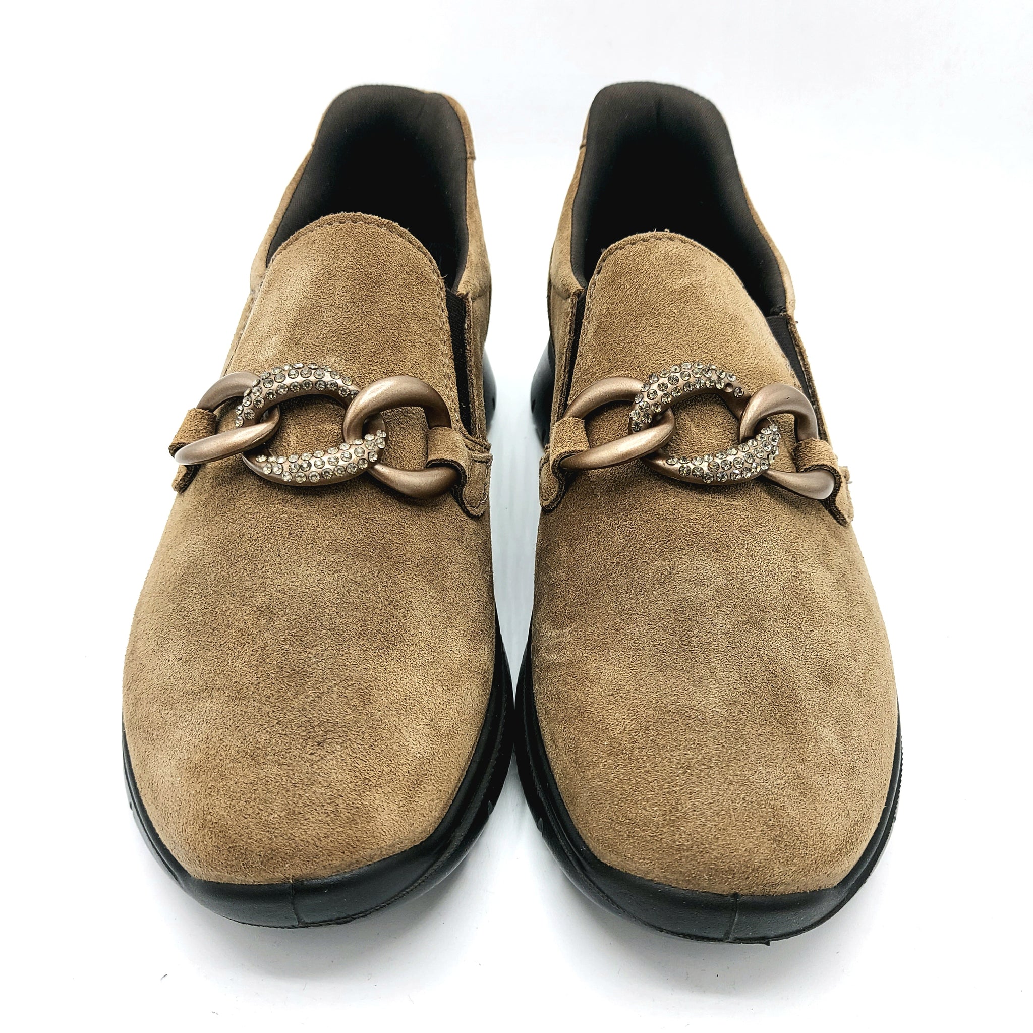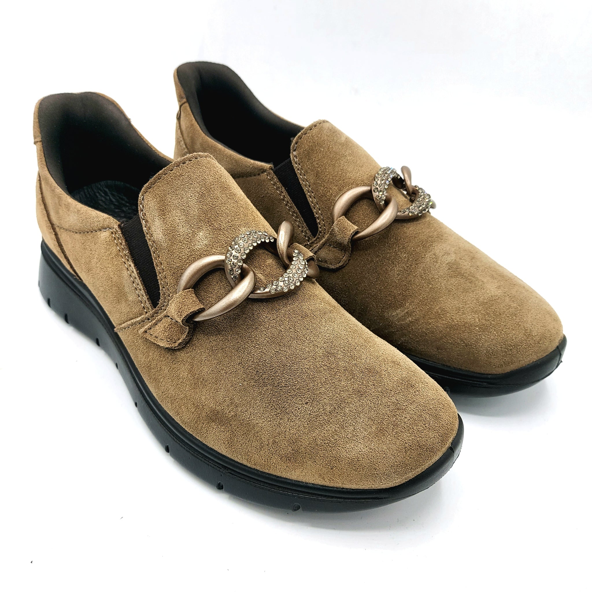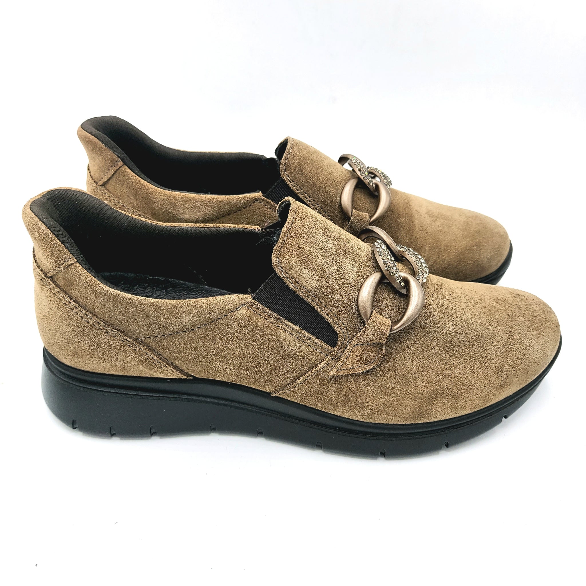 Queste slip-on in pelle scamosciata fango offrono comfort e stile con un elegante accessorio a catena impreziosita da strass. Si aggiunge una calzata step in con rinforzo al tallone che permetta la calzata senza sforzi e senza l'aiuto di un calzante. Perfette per aggiungere un tocco di brillantezza a ogni outfit, uniscono praticità e raffinatezza in un modello facile da indossare ogni giorno.