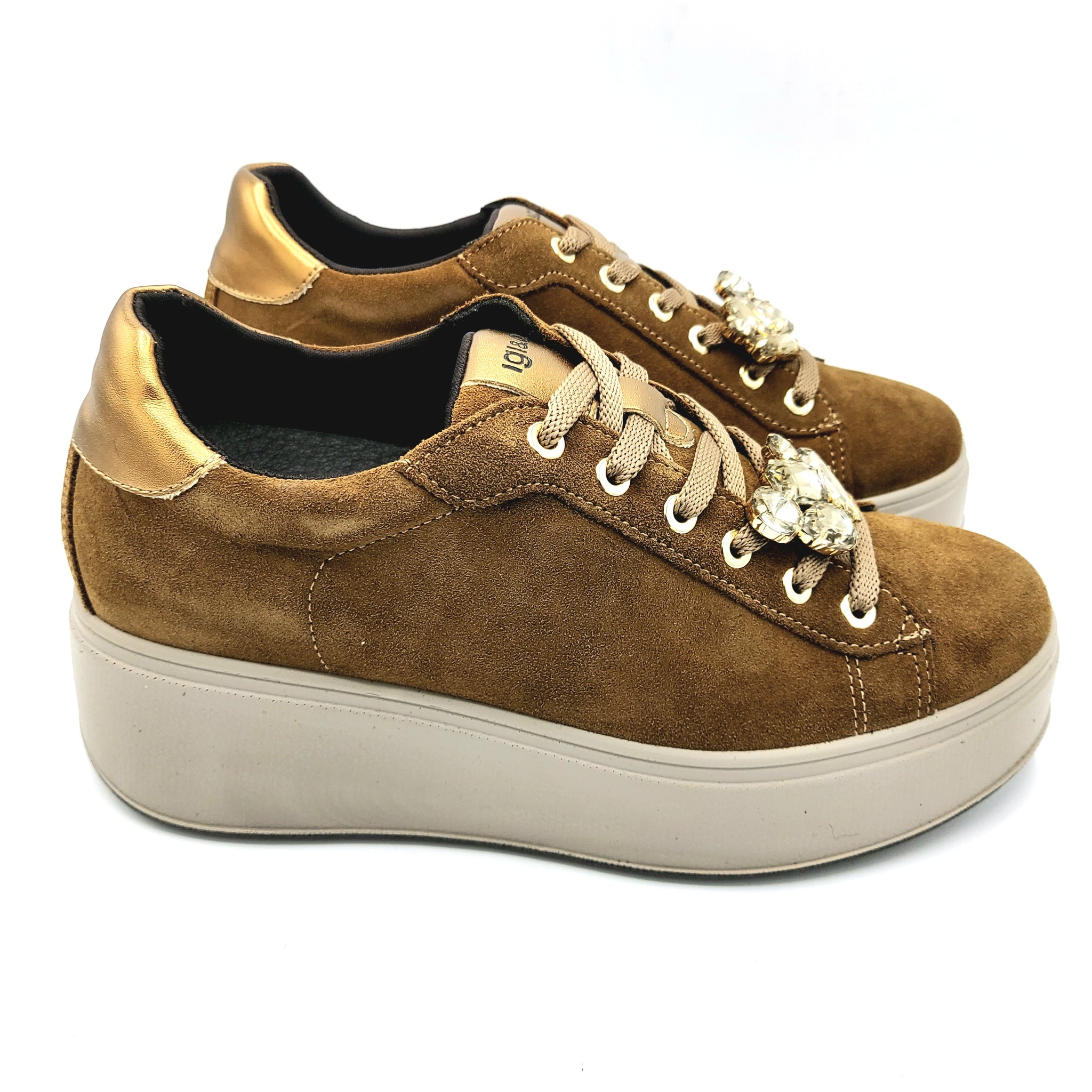 Le sneakers Igi&co 8671244 in pelle scamosciata cognac uniscono stile e comfort, con una zeppa di 5,5 cm che sostiene l’altezza senza rinunciare alla praticità. La decorazione di strass removibile permette di personalizzare il look, rendendole ideali per ogni occasione. Perfette per chi cerca una calzatura versatile e raffinata.