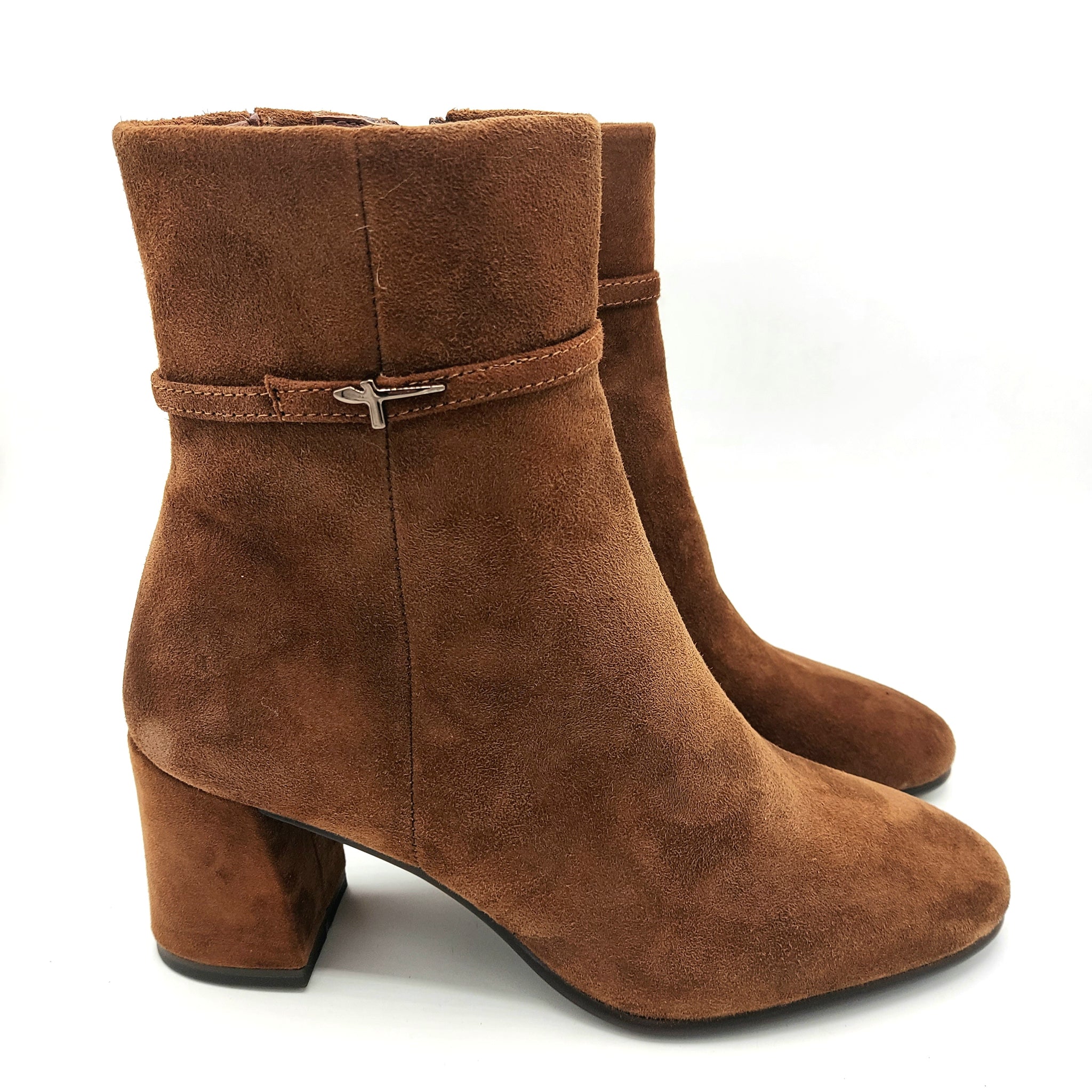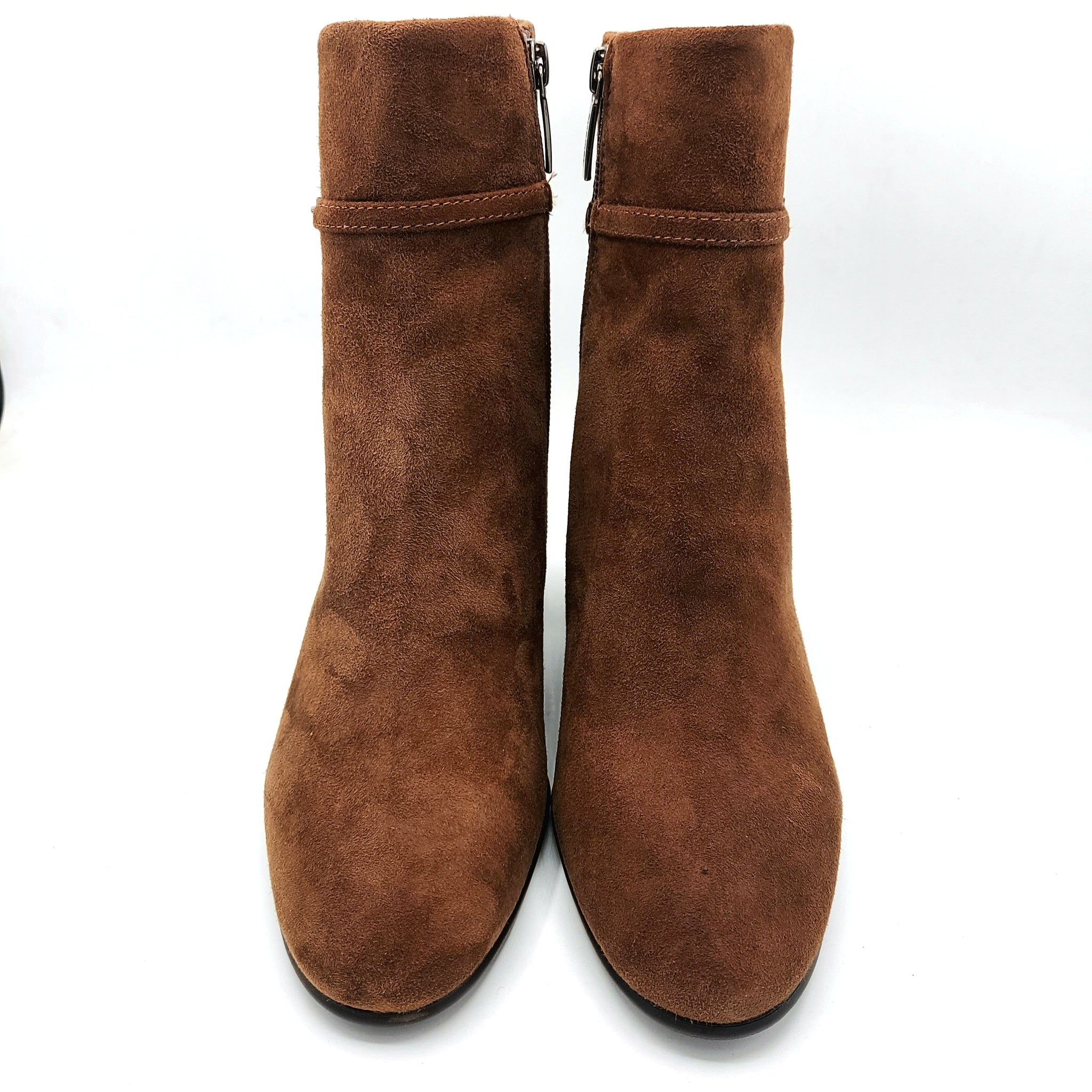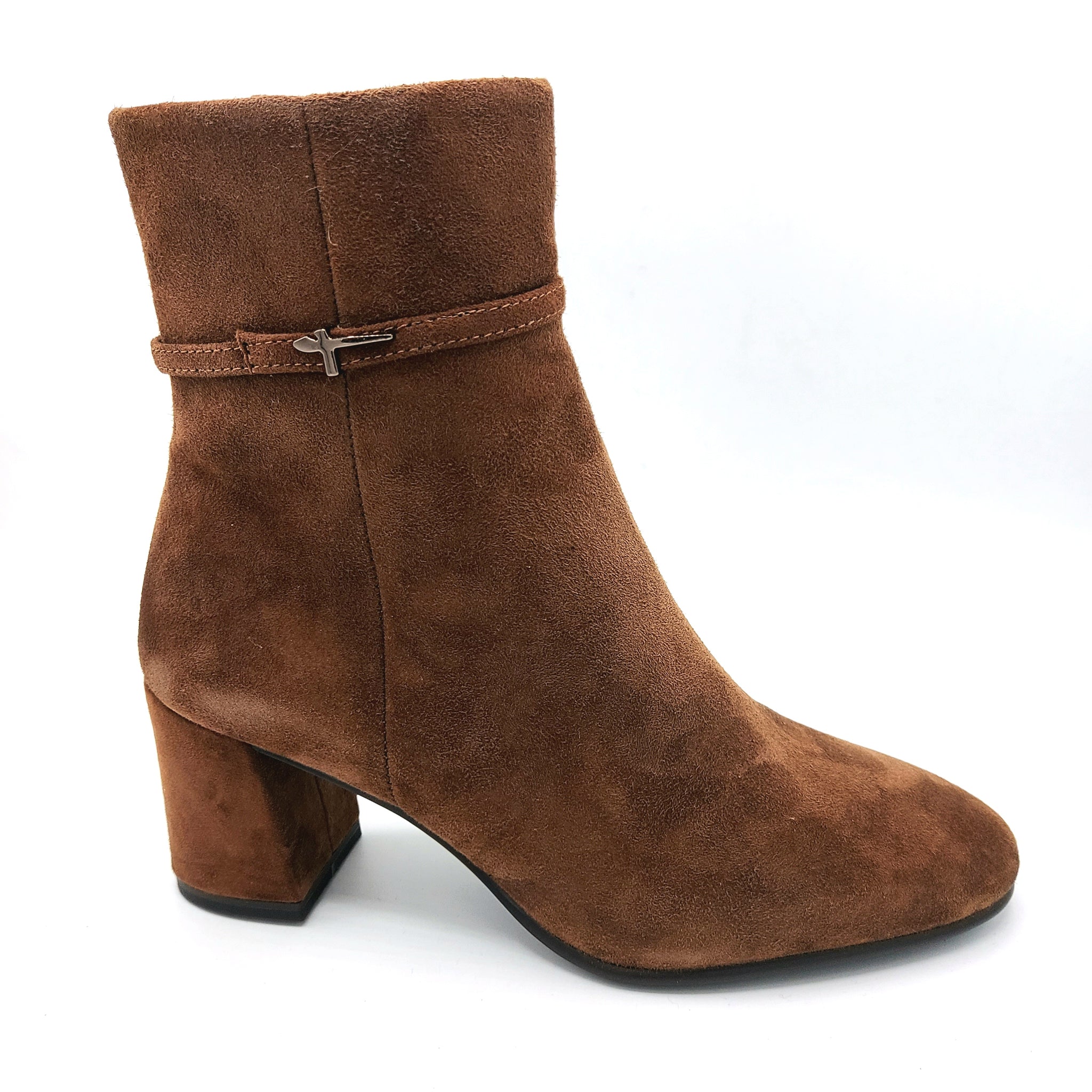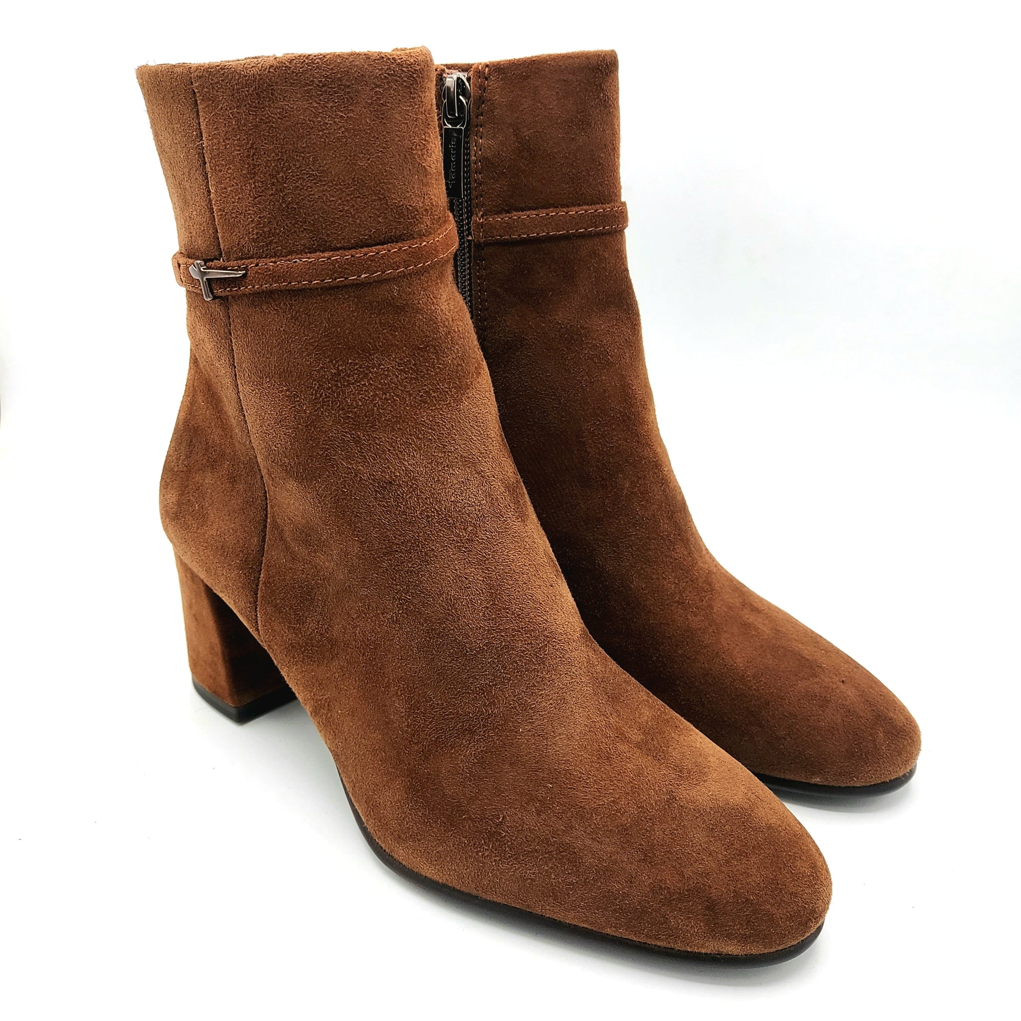 Questo stivaletto donna in morbido camoscio marrone unisce eleganza e comfort grazie alla sua fascetta delicata con logo e al tacco comodo di 7 cm, ideale per accompagnarti in ogni occasione con stile senza rinunciare al benessere.