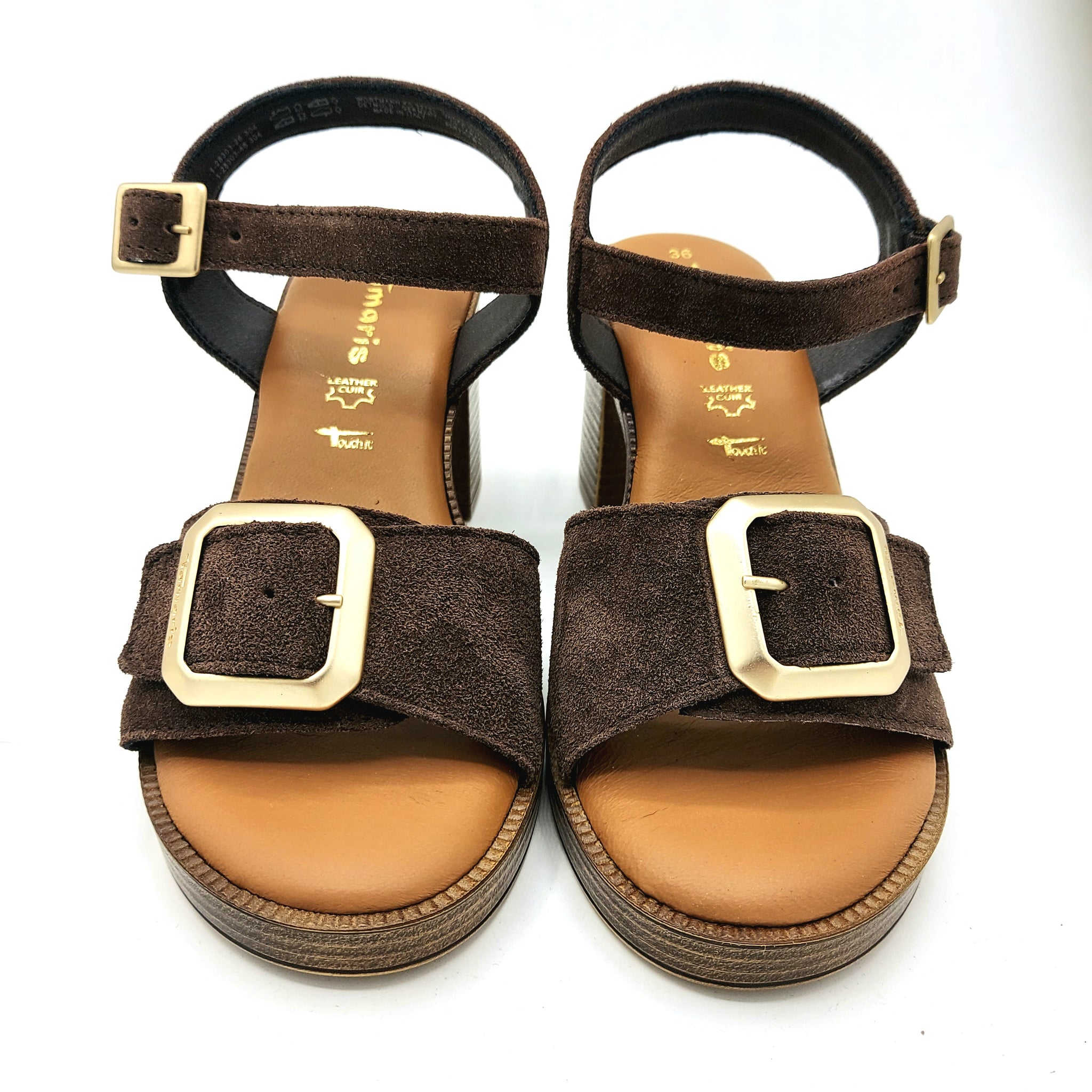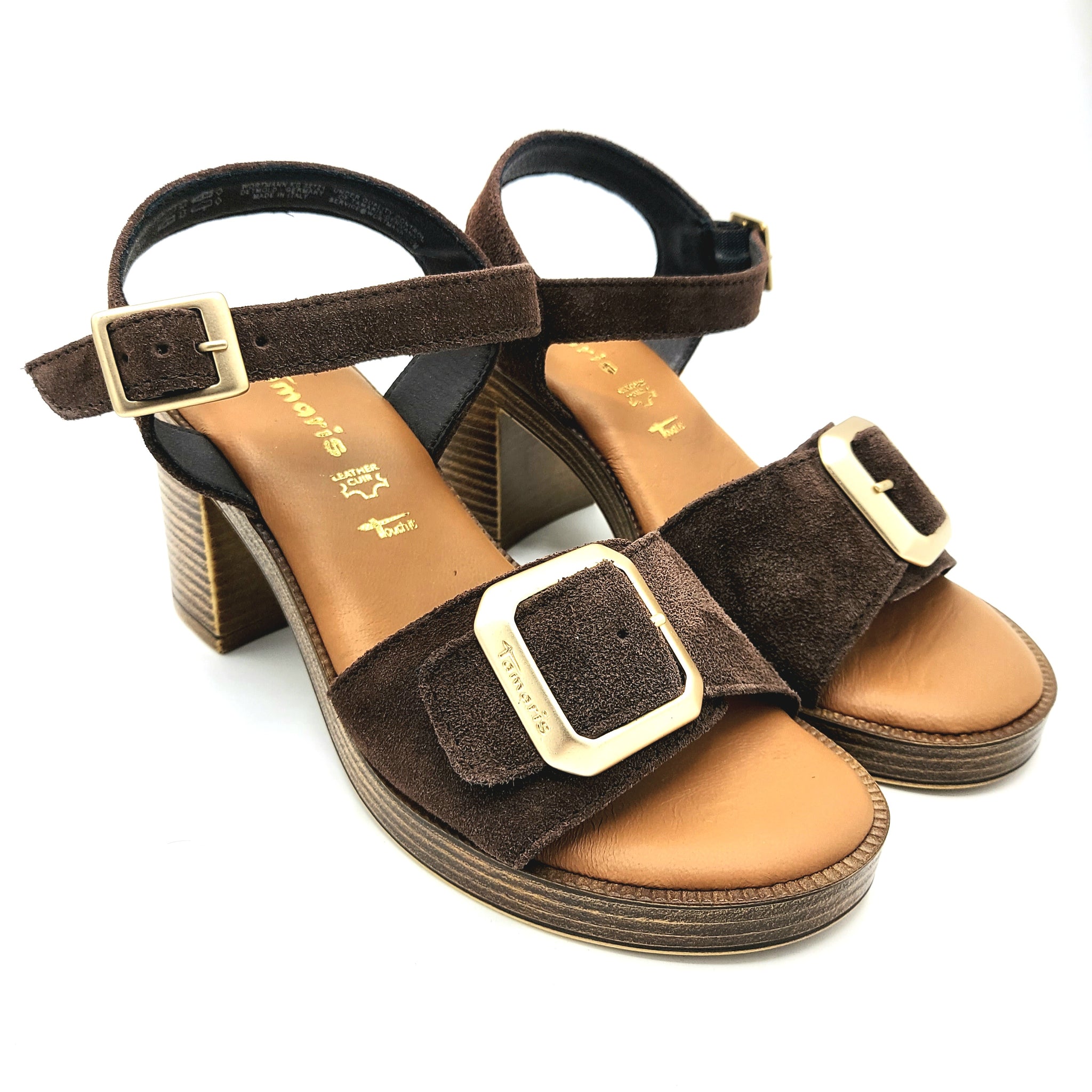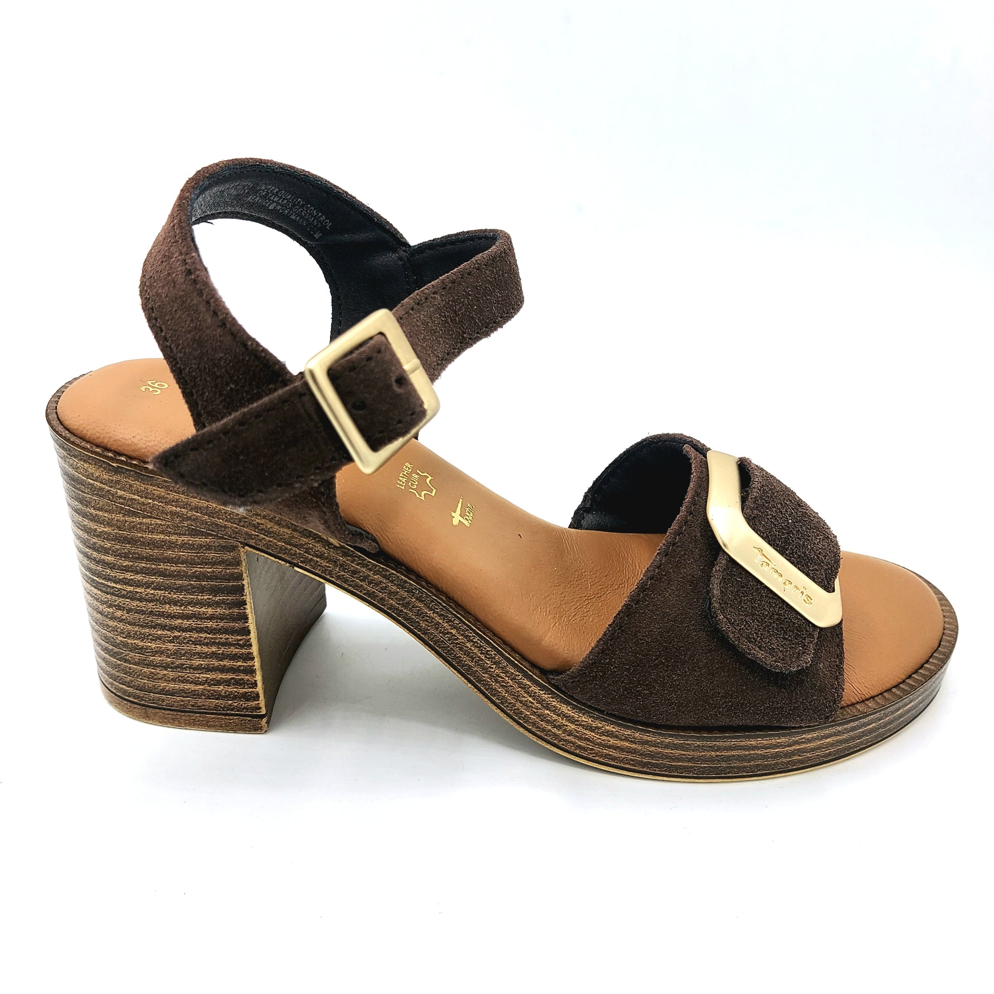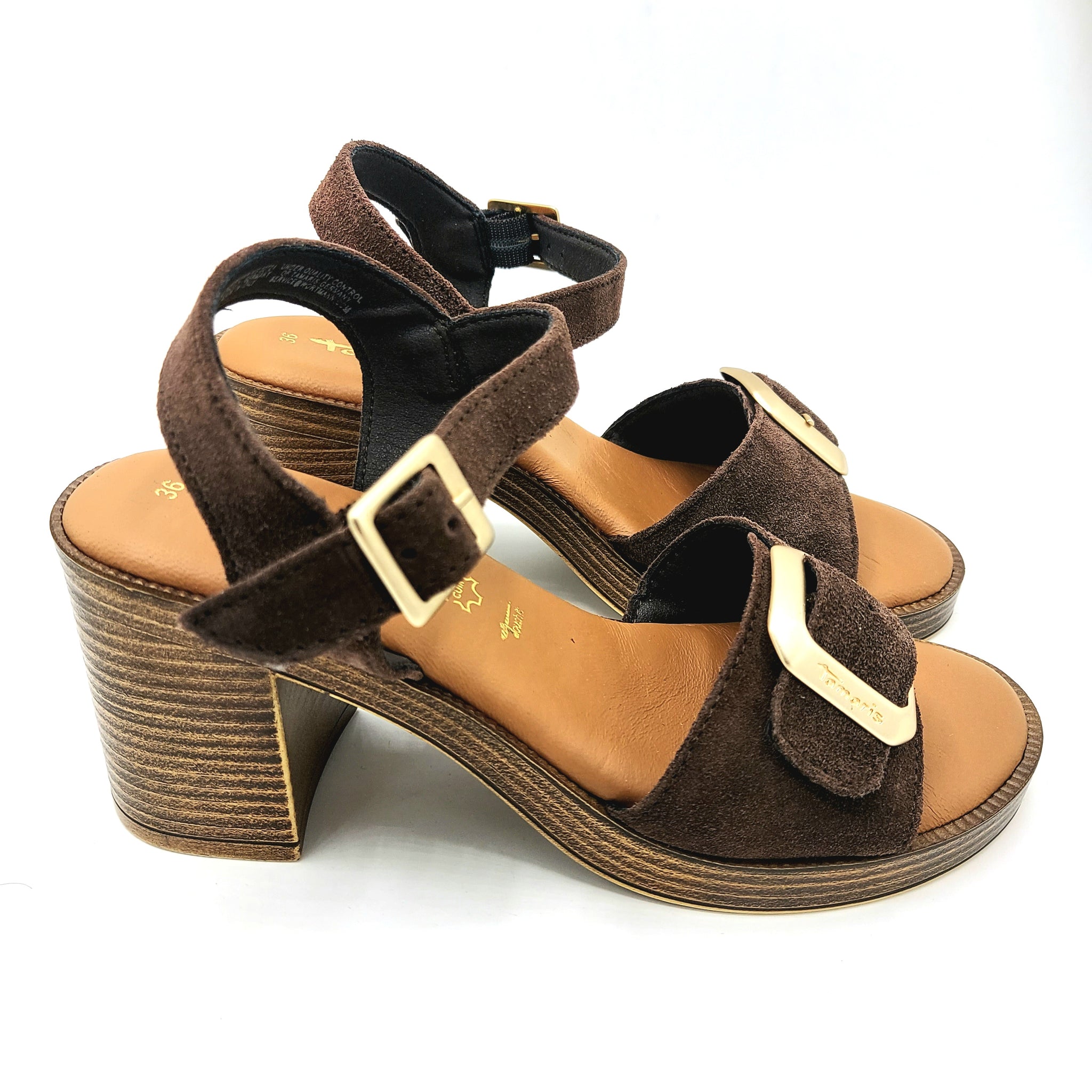 Sandalo elegante in morbida pelle scamosciata color testa di moro, perfetto per chi ricerca comfort e stile. Caratterizzato da un pratico braccialetto alla caviglia che assicura una vestibilità stabile, tacco di 7,5 cm e plateau di 1,5 cm che regalano una silhouette affusolata senza sacrificare la comodità. Il sottopiede imbottito garantisce un supporto morbido durante tutta la giornata, ideale per chi desidera indossare un sandalo sofisticato senza rinunciare al benessere dei piedi. Una scelta versatile per occasioni casual e più eleganti.
