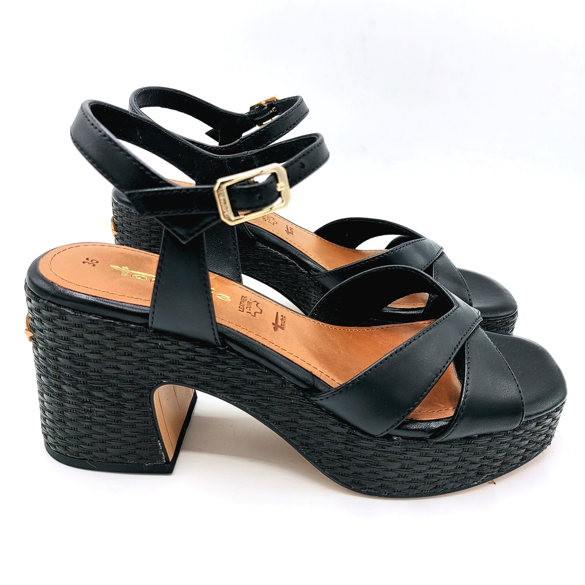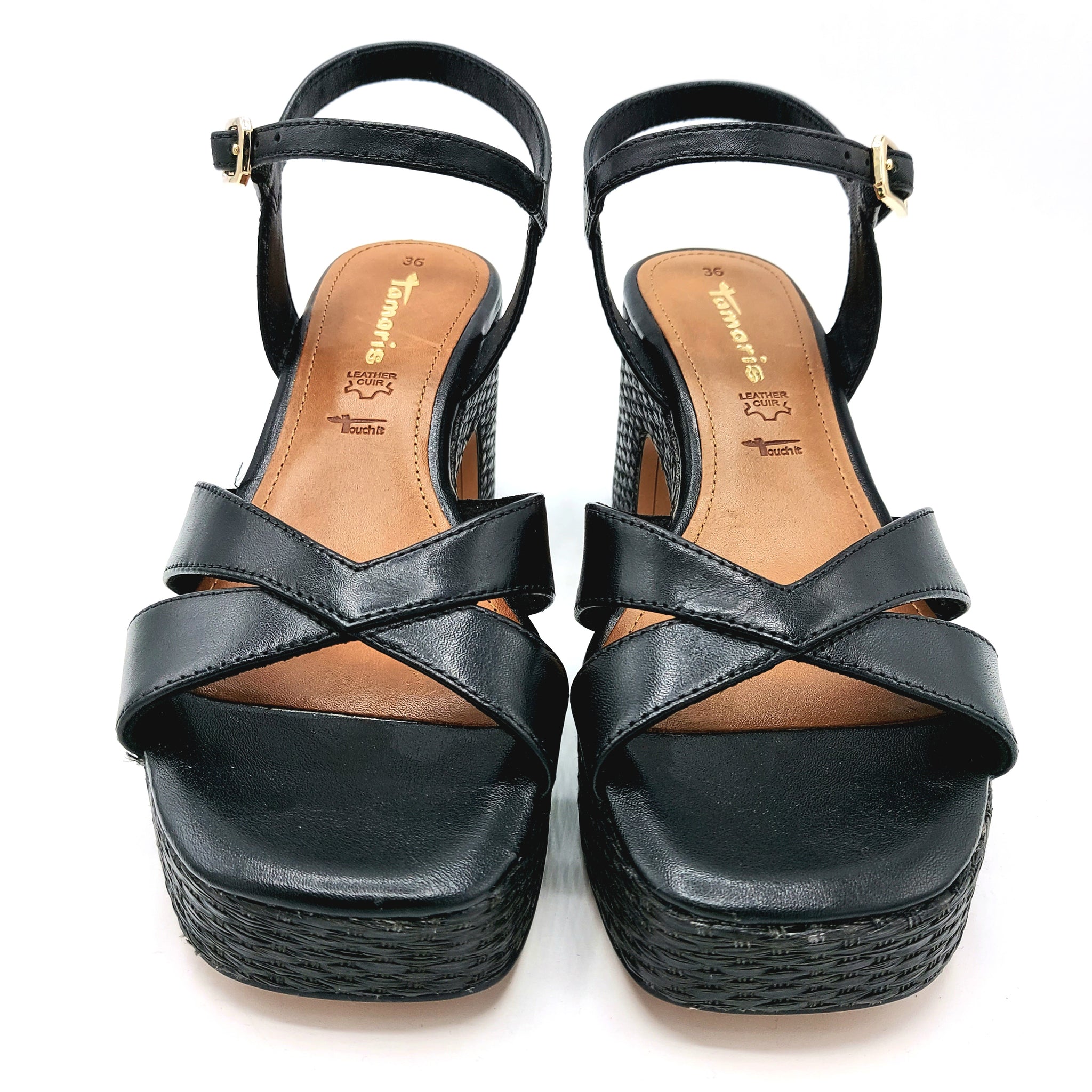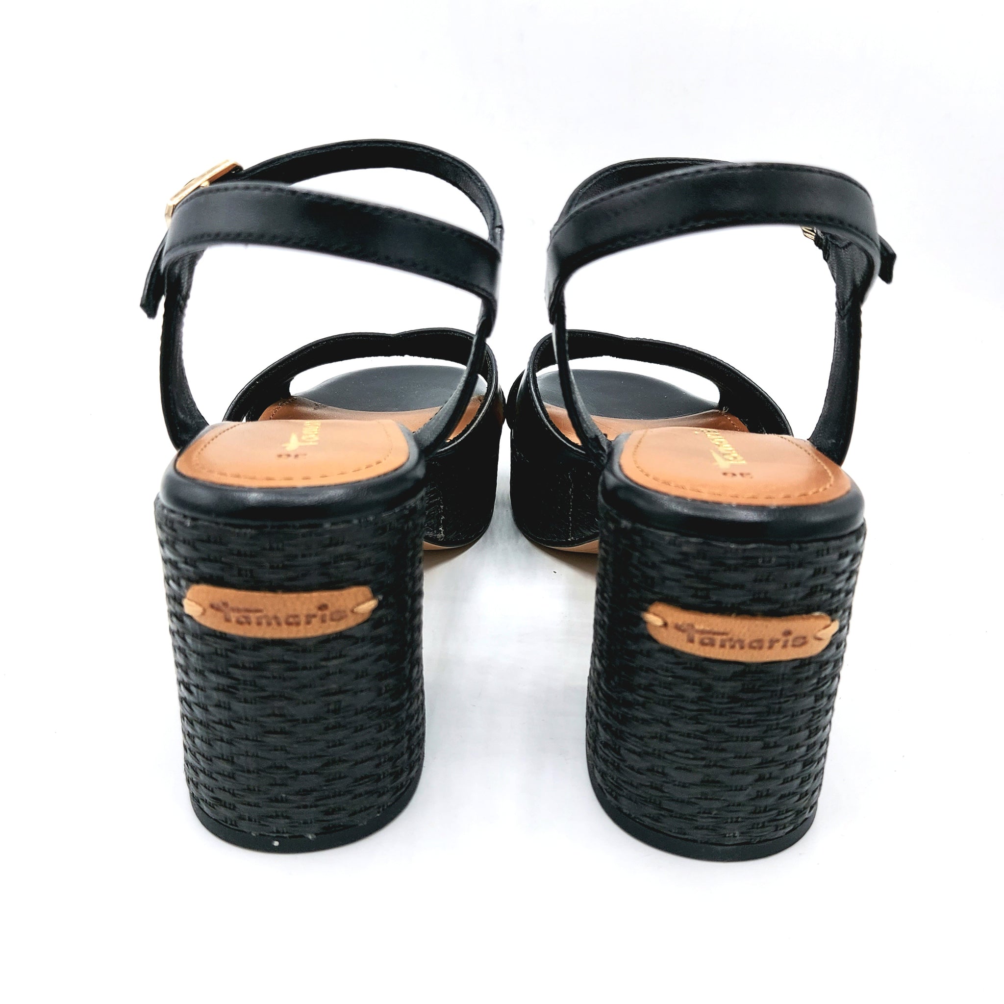 Sandalo incrociato in pelle nera con elegante braccialetto alla caviglia. Caratterizzato da un tacco largo di 8 cm e plateau di 3 cm, entrambi rivestiti in rafia naturale per un comfort superiore e un'estetica sofisticata. Un modello versatile che unisce stile e praticità, perfetto per occasioni casual e semi-formali.