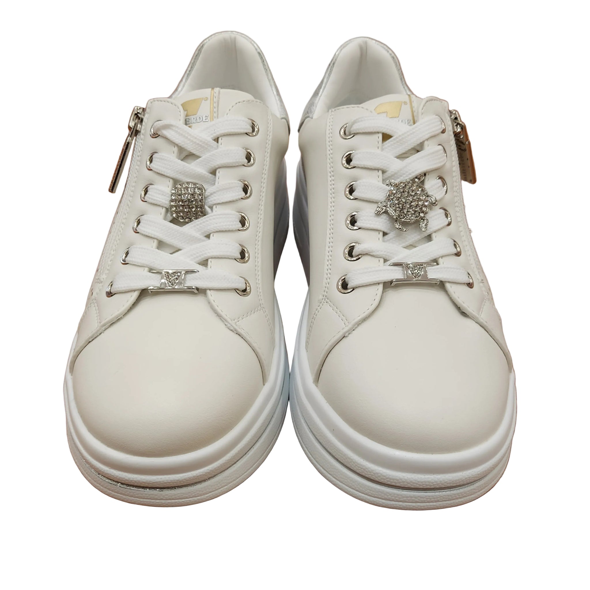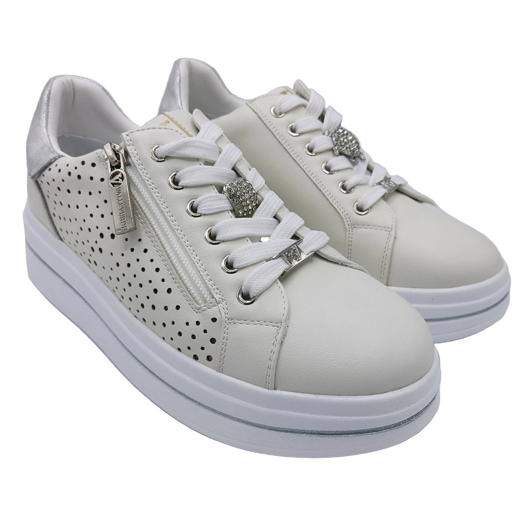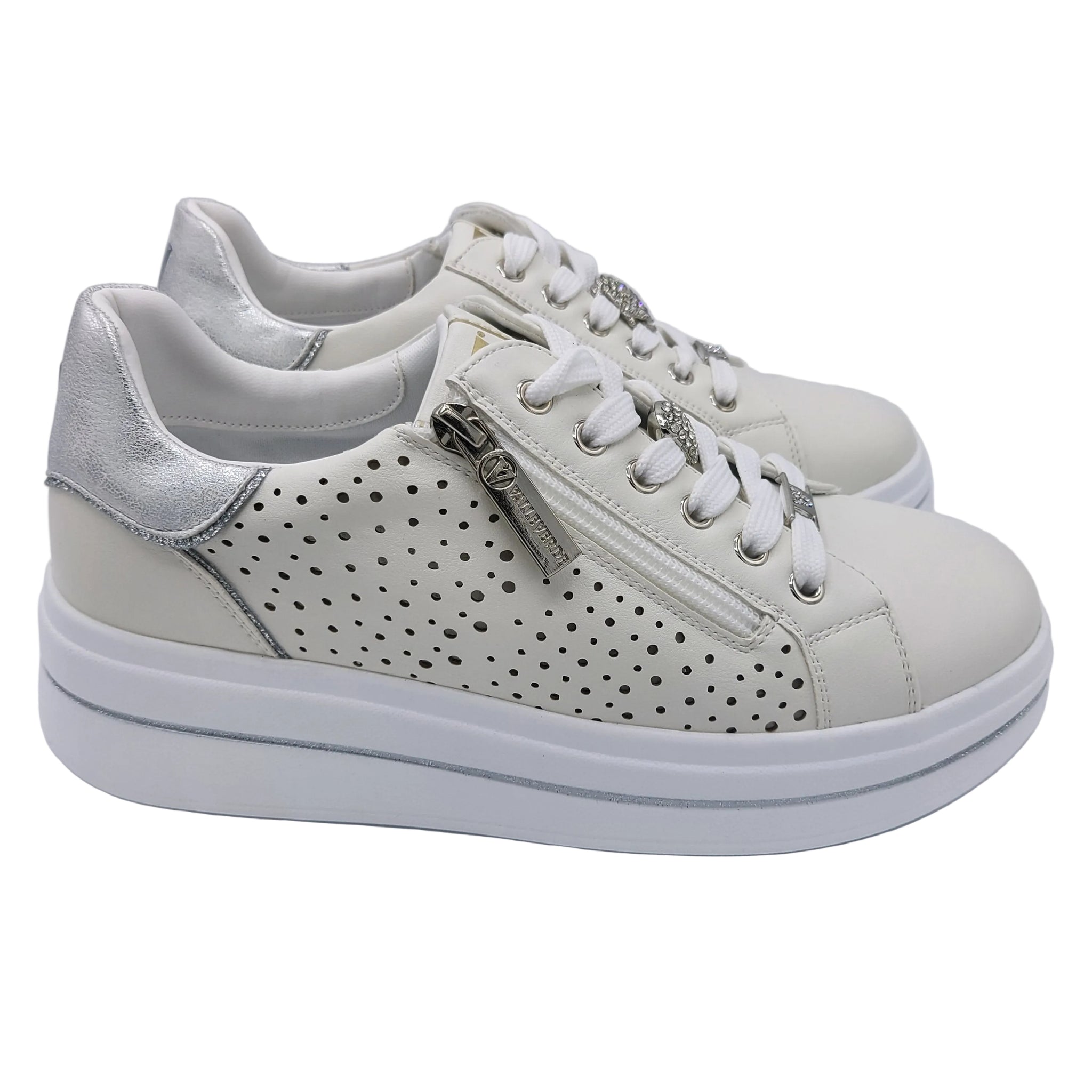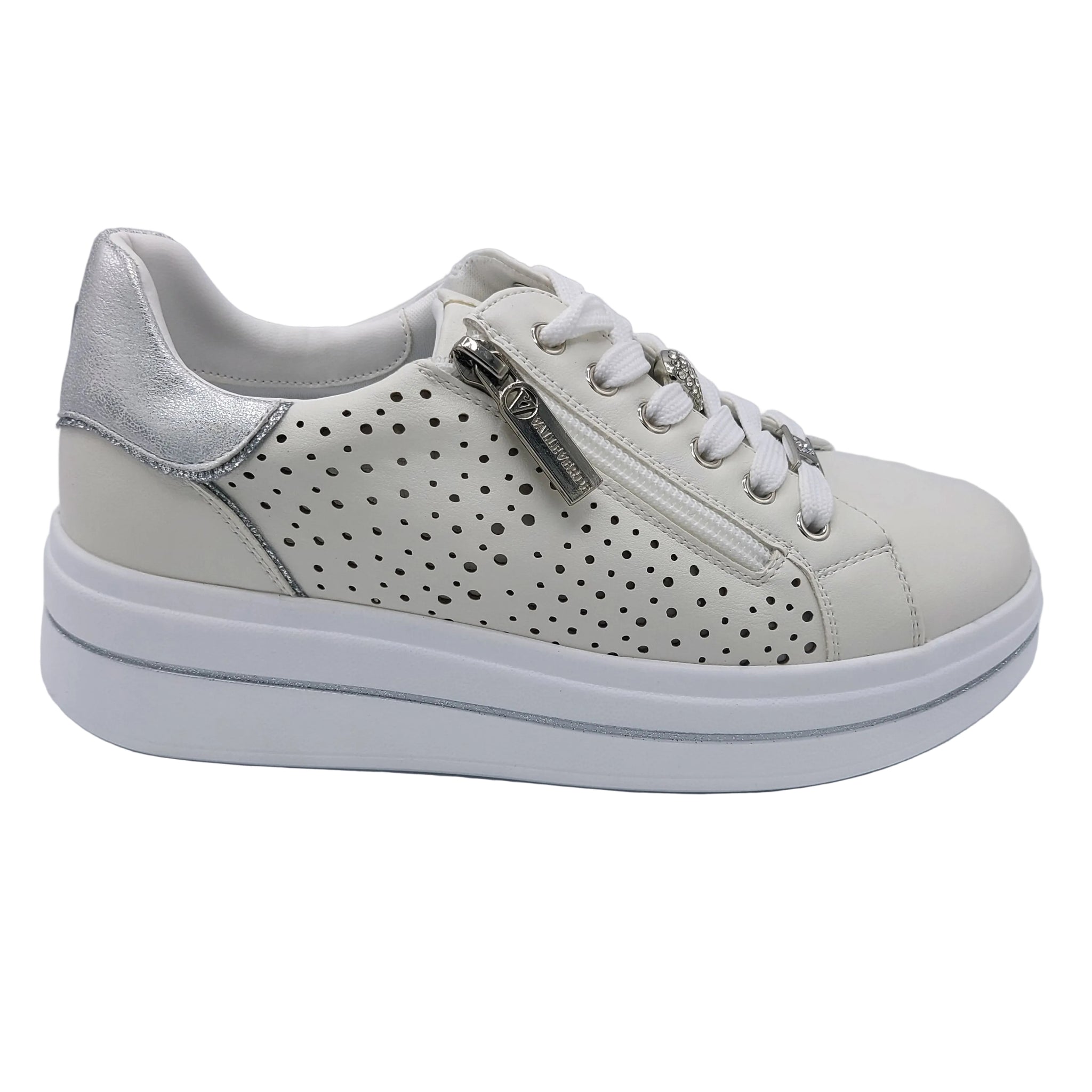 Sneakers donna Valleverde 35493 in bianco con tomaia traforata che garantisce massima traspirazione e leggerezza. Dotata di pratici lacci e cerniera laterale per una vestibilità comoda e un'allacciatura veloce. Il design traforato mantiene il piede fresco durante l'intera giornata, mentre la cerniera consente di indossare la scarpa senza sforzo. Perfetta per chi cerca stile e funzionalità in un'unica soluzione.