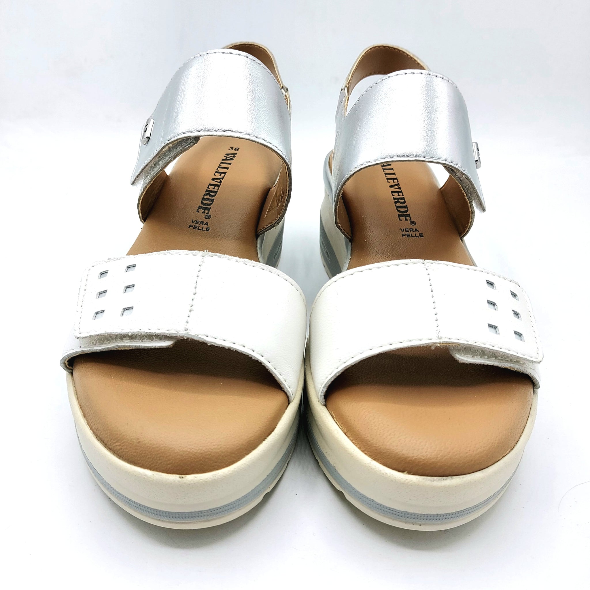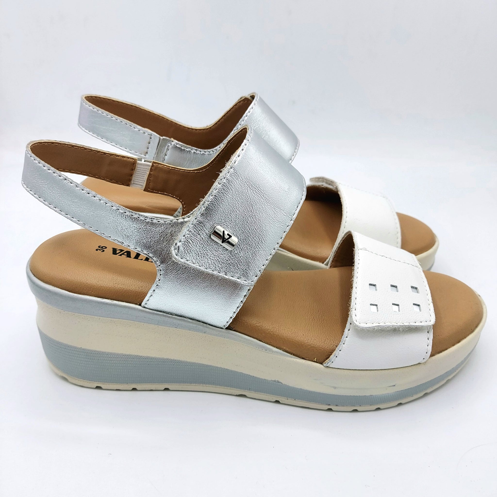 Sandalo in pelle bianca con riporti argento, con doppio velcro regolabile per una calzata comoda e personalizzata. Sottopiede imbottito che garantisce supporto e ammortizzazione durante tutta la giornata. Zeppa di 6 cm che dona eleganza e aumenta l'altezza. Perfetto per chi ricerca comfort senza compromessi sulla qualità e lo stile.