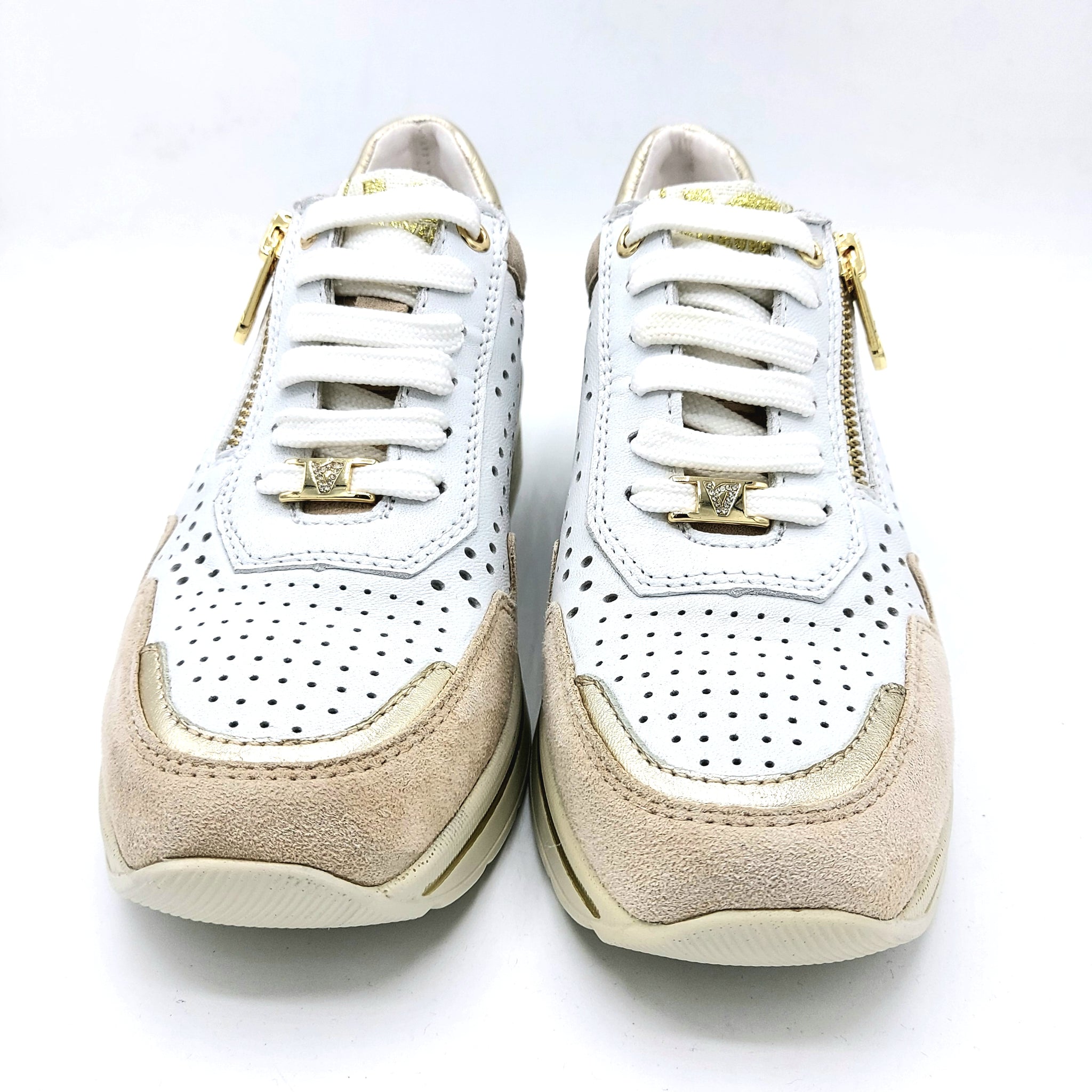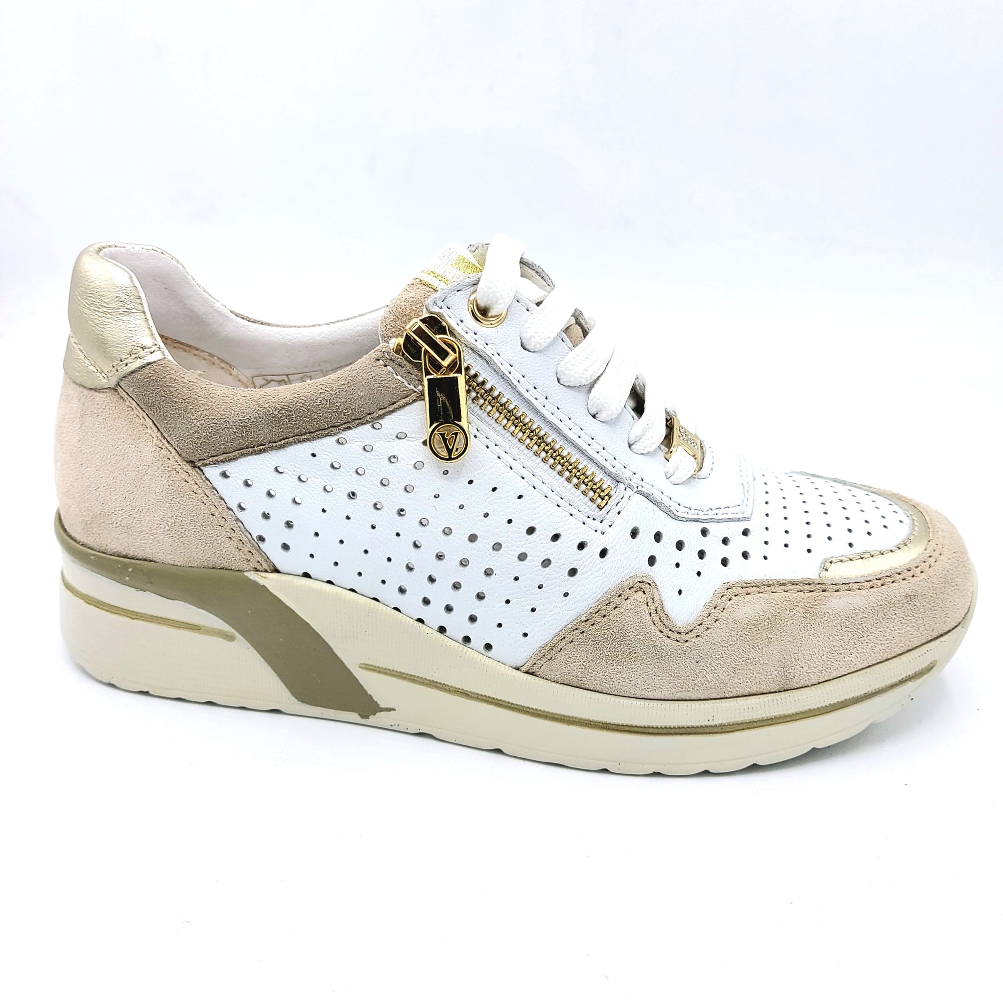 Valleverde VNF552W bianco oro sneakers donna in pelle traforata con chiusura allaccio e cerniera. Dotata di soletta estraibile in memory foam