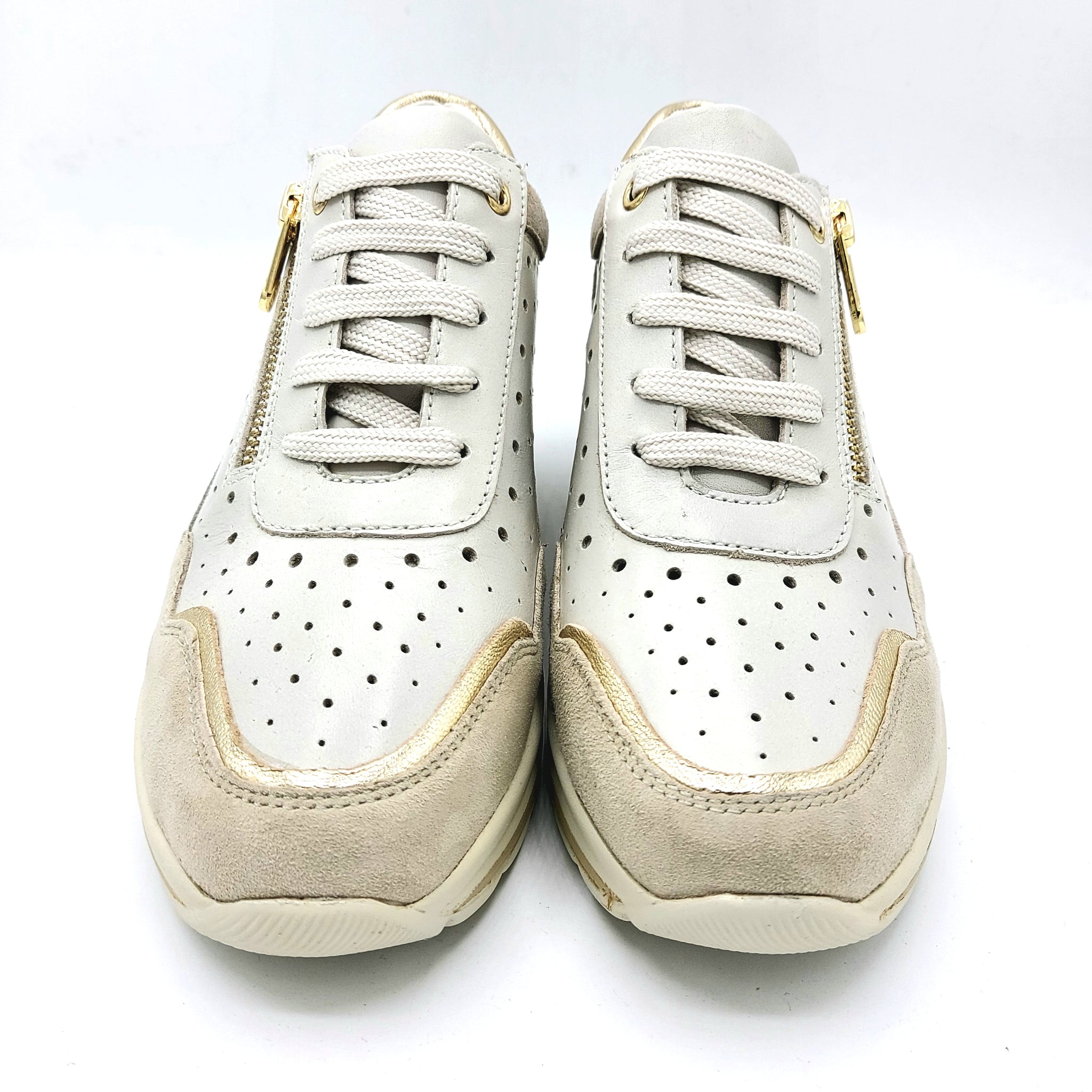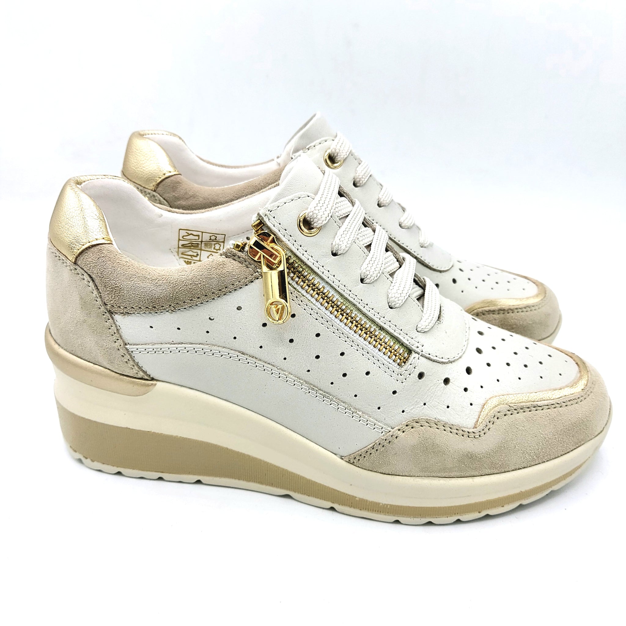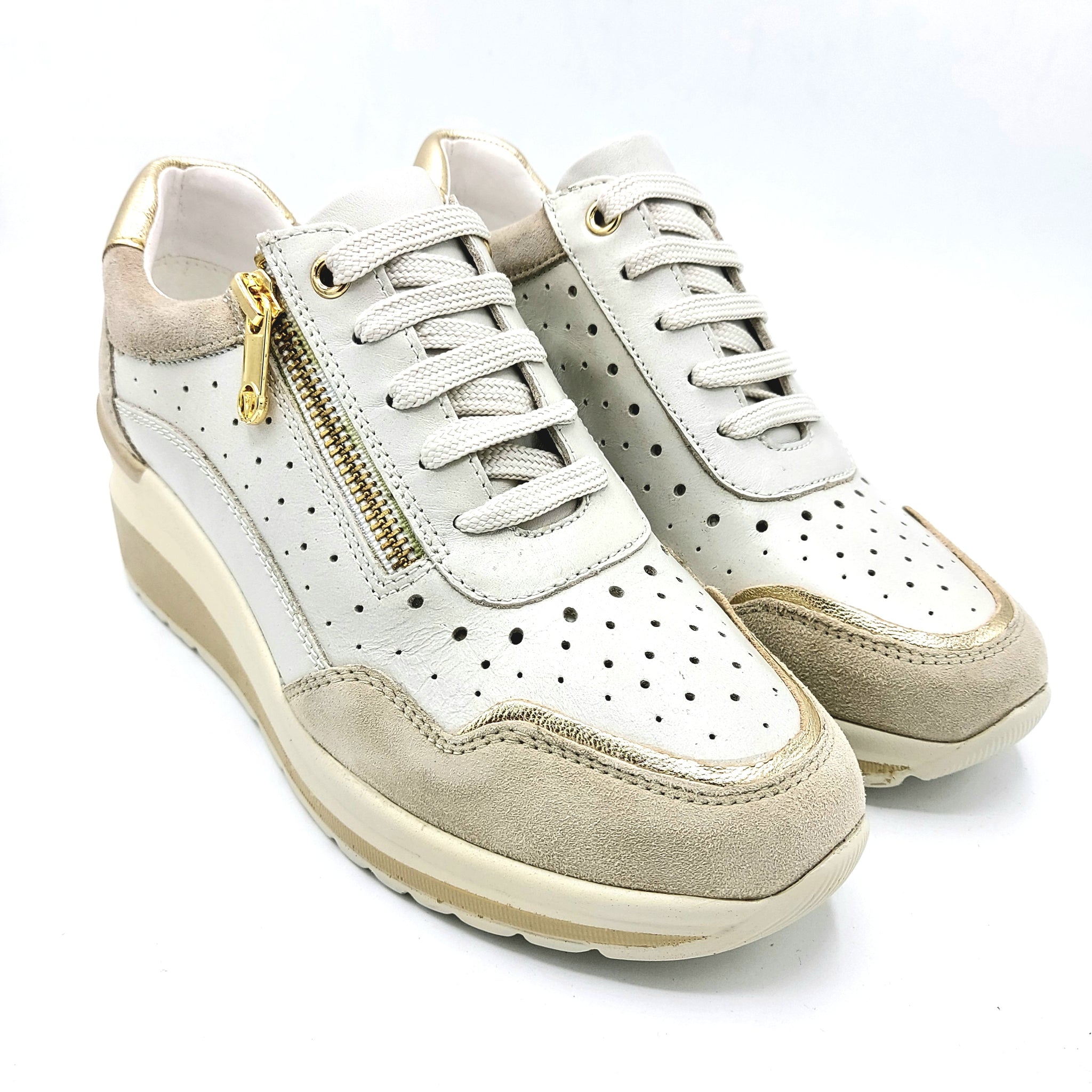 Sneaker donna in pelle traforata crema, perfetta per uno stile casual e versatile. Caratterizzata da una pratica chiusura con lacci e cerniera laterale che garantisce una vestibilità personalizzata e facile da indossare. La zeppa di 5,5 cm assicura comfort e un'elegante silhouette allungata. Ideale per chi ricerca una scarpa leggera e traspirante, adatta a ogni occasione della giornata.